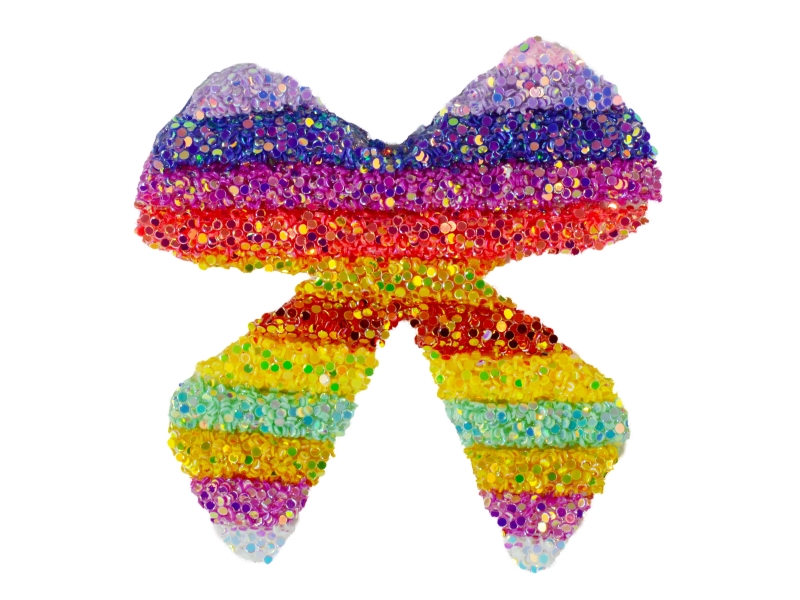 Patch termoadesiva flessibile, formata da tubolari rivestiti da particelle di glitter multicolor ad alto spessore.