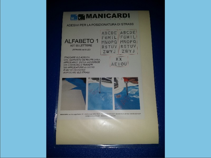 Lettere adesive per la posizionatura degli strass con applicatori a caldo o ultrasuoni,si possono acquistare in fogli dove è riprodotto un alfabeto completo